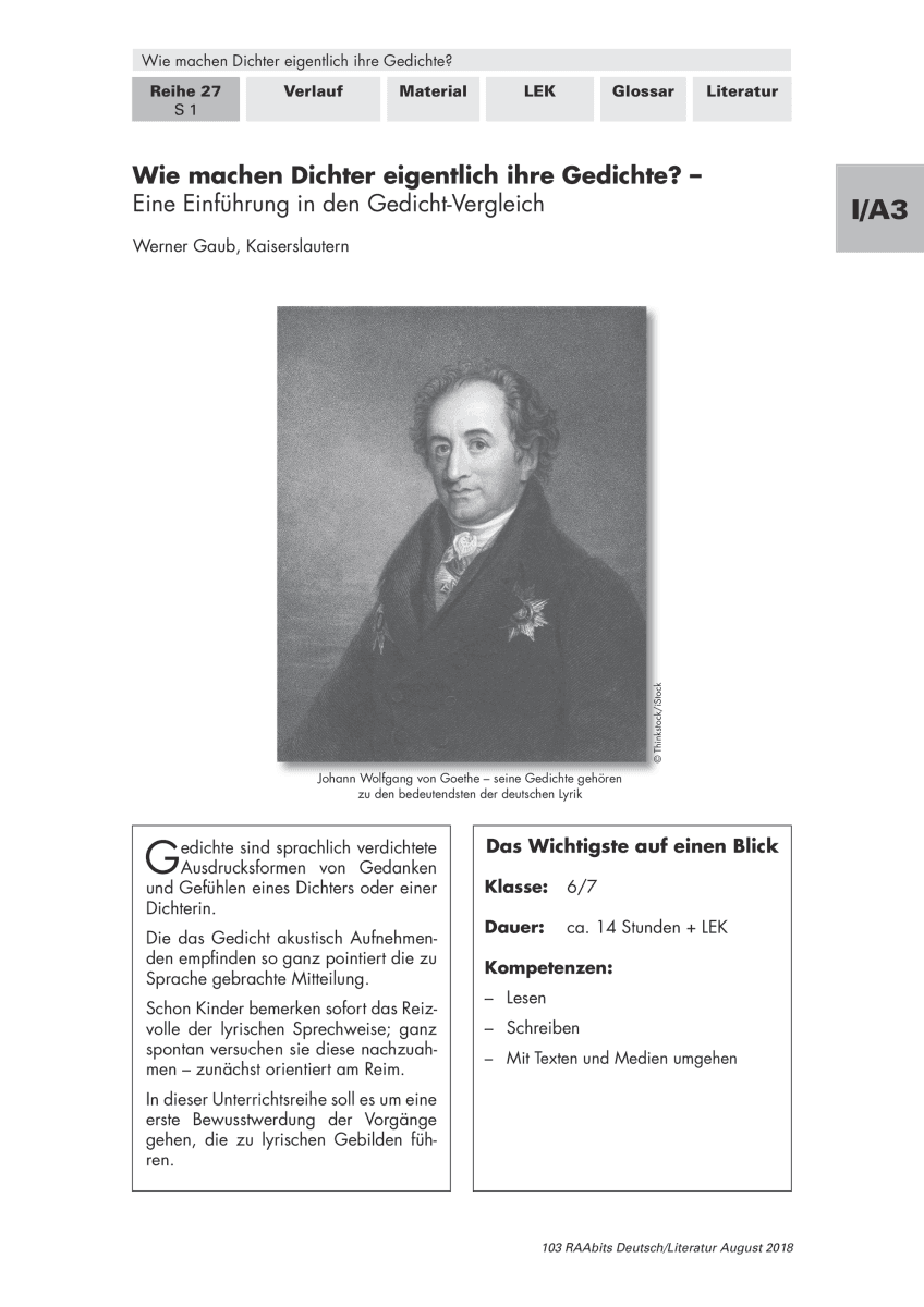 Mit den direkt einsetzbaren Unterrichtsbeiträgen zum Themenschwerpunkt Lyrik und Poesie bietet RAABE Ihnen Unterrichtsmaterial, um ein breites Bild der Lyrik in Ihren Unterricht zu bringen. Von der Lyrik der Romantik im Deutschunterricht über lyrische Texte zu verschiedenen Lebensphasen im Englischunterricht bis hin zu Liedern und Rap-Texten im Musikunterricht werden verschiedene Fächer abgedeckt. Verwenden Sie die Beiträge für mehrere Unterrichtsstunden oder nutzen Sie einzelne Elemente wie Arbeitsblätter und Übungen für die eigene Unterrichtsgestaltung.
