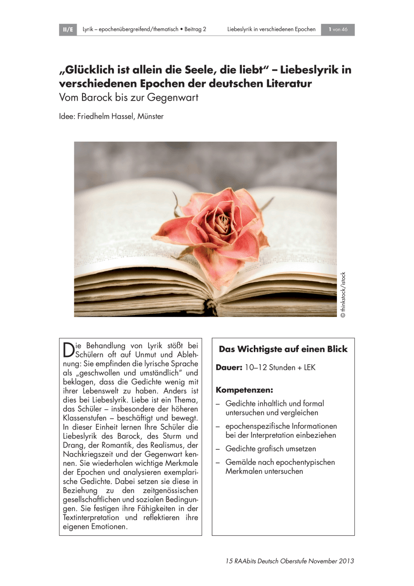 Oftmals sind Schüler:innen wenig begeistert beim Einsatz von Gedichten im Unterricht. Doch je älter die Lernenden sind, desto eher können sie sich mit der wunderschönen Liebeslyrik anfreunden. Mit unserer Lerneinheit zu „Glücklich ist allein die Seele, die liebt“ begegnet Ihre Klasse vielen literarischer Epochen wie Barock oder Sturm und Drang. Dabei analysieren sie nicht nur die Liebeslyrik, sondern erhalten auch die Möglichkeit, ihre eigenen Gefühle zu reflektieren. Aber nicht nur im Deutschunterricht können Sie viele Gedichte einsetzen. Auch im Englischunterricht bekommen die Lernenden mit den Beiträgen von RAABE Einblicke in klassische und zeitgenössische Gedichte. Dabei steht nicht nur die reine Analyse im Fokus. Vor allem sollen sie sich Gedanken machen, wie Gedichte aufgebaut sind, was sie ausmacht und wie man selbst Poetry Slams durchführt. Einen historischen Einblick erhalten Ihre Schüler:innen mit den Unterrichtsmaterialien zu Ovids „Heilmittel gegen die Liebe“. Dort geht er dem alternativen Lebensstil nach. Ihre Klasse begleitet ihn dabei Schritt für Schritt und interpretiert den Text.