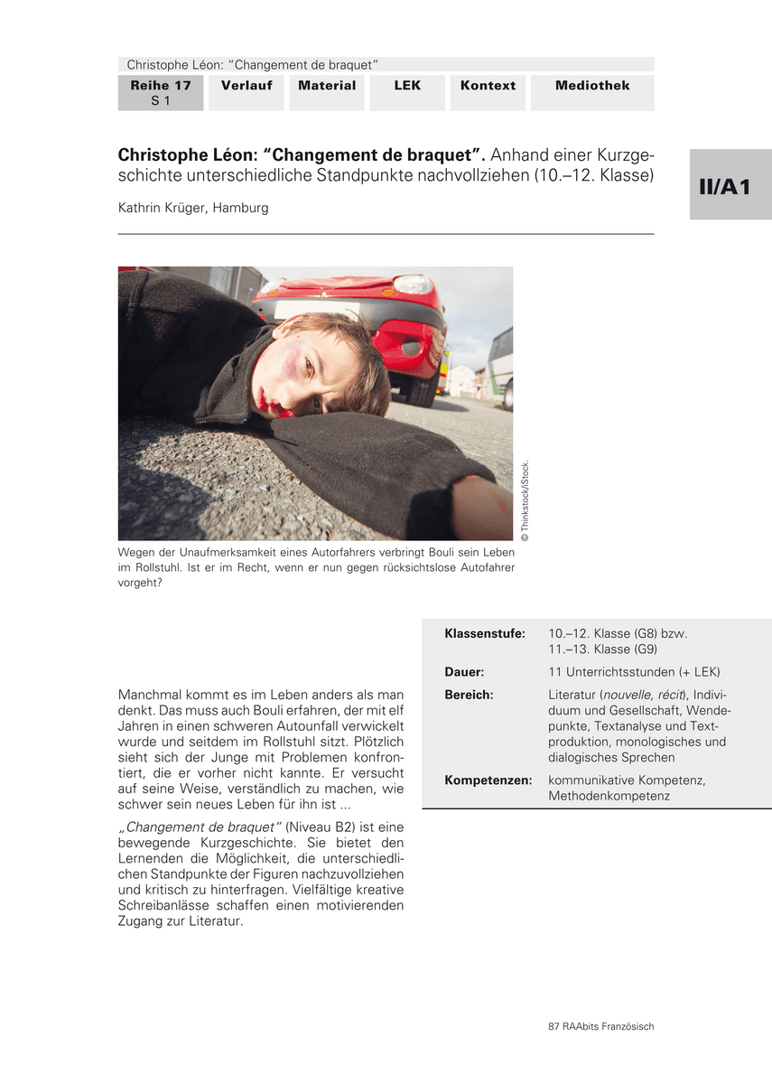 Bereich: | Literatur (nouvelle, récit), Individuum und Gesellschaft, Wendepunkte, Textanalyse und Textproduktion, monologisches und dialogisches Sprechen |