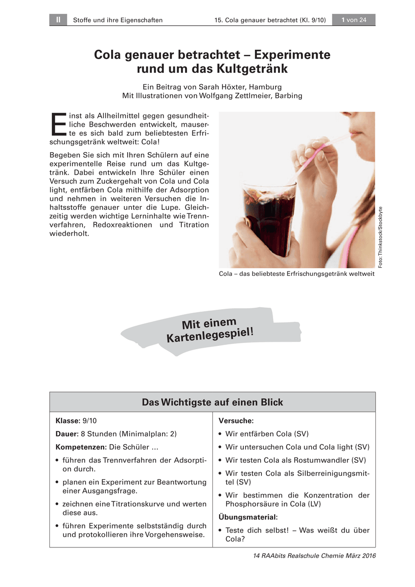 Einst als Allheilmittel gegen gesundheitliche Beschwerden entwickelt, mauserte es sich bald zum beliebtesten Erfrischungsgetränk weltweit: Cola! Begeben Sie sich mit Ihren Schülern auf eine experimentelle Reise rund um das Kultgetränk. Dabei entwickeln Ihre Schüler einen Versuch zum Zuckergehalt von Cola und Cola light, entfärben Cola mithilfe der Adsorption und nehmen in weiteren Versuchen die Inhaltsstoffe genauer unter die Lupe. Gleichzeitig werden wichtige Lerninhalte wie Trennverfahren, Redoxreaktionen und Titration wiederholt.