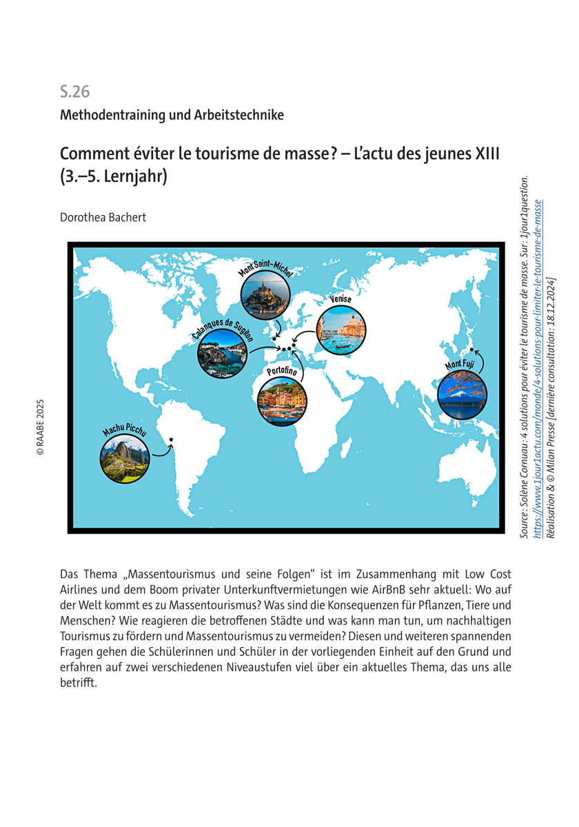 Das Thema „Massentourismus und seine Folgen“ ist im Zusammenhang mit Low Cost Airlines und dem Boom privater Unterkunftvermietungen wie AirBnB sehr aktuell: Wo auf der Welt kommt es zu Massentourismus? Was sind die Konsequenzen für Pflanzen, Tiere und Menschen? Wie reagieren die betroffenen Städte und was kann man tun, um nachhaltigen Tourismus zu fördern und Massentourismus zu vermeiden? Diesen und weiteren spannenden Fragen gehen die Schülerinnen und Schüler in der vorliegenden Einheit auf den Grund und erfahren auf zwei verschiedenen Niveaustufen viel über ein aktuelles Thema, das uns alle betrifft.
