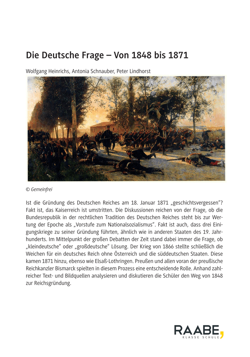 Ist die Gründung des Deutschen Reiches am 18. Januar 1871 „geschichtsvergessen“? Fakt ist, das Kaiserreich ist umstritten. Die Diskussionen reichen von der Frage, ob die Bundesrepublik in der rechtlichen Tradition des Deutschen Reiches steht, bis zur Wertung der Epoche als „Vorstufe zum Nationalsozialismus“. Fakt ist auch, dass drei Einigungskriege zu seiner Gründung führten, ähnlich wie in anderen Staaten des 19. Jahrhunderts. Im Mittel-punkt der großen Debatten der Zeit stand dabei immer die Frage, ob „kleindeutsche“ oder „großdeutsche“ Lösung. Der Krieg von 1866 stellte schließlich die Weichen für ein deutsches Reich ohne Österreich, allerdings ohne die süddeutschen Staaten. Diese kamen 1871 hinzu, ebenso wie Elsaß-Lothringen. Preußen und allen voran der preußische Reichkanzler Bismarck spielten in diesem Prozess eine entscheidende Rolle. Anhand zahlreicher Text- und Bildquellen analysieren und diskutieren die Schüler den Weg von 1848 zur Reichsgründung.