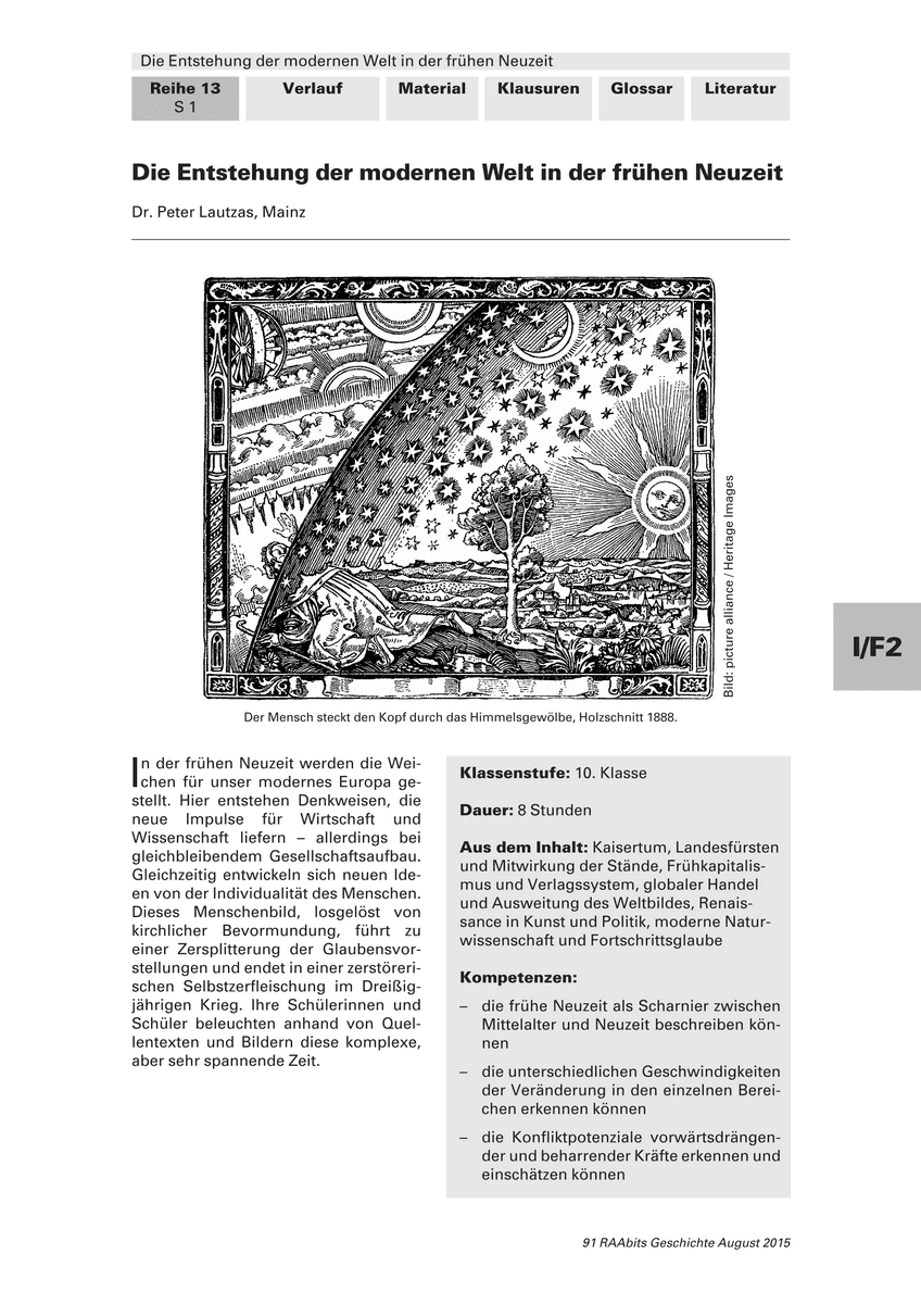 In der frühen Neuzeit werden die Weichen für unser modernes Europa gestellt. Hier entstehen Denkweisen, die neue Impulse für Wirtschaft und Wissenschaft liefern – allerdings bei gleichbleibendem Gesellschaftsaufbau. Gleichzeitig entwickeln sich neue Ideen von der Individualität des Menschen. Dieses Menschenbild, losgelöst von kirchlicher Bevormundung, führt zu einer Zersplitterung der Glaubensvorstellungen und endet in einer zerstörerischen Selbstzerfleischung im Dreißigjährigen Krieg. Ihre Schülerinnen und Schüler beleuchten anhand von Quellentexten und Bildern diese komplexe, aber sehr spannende Zeit.