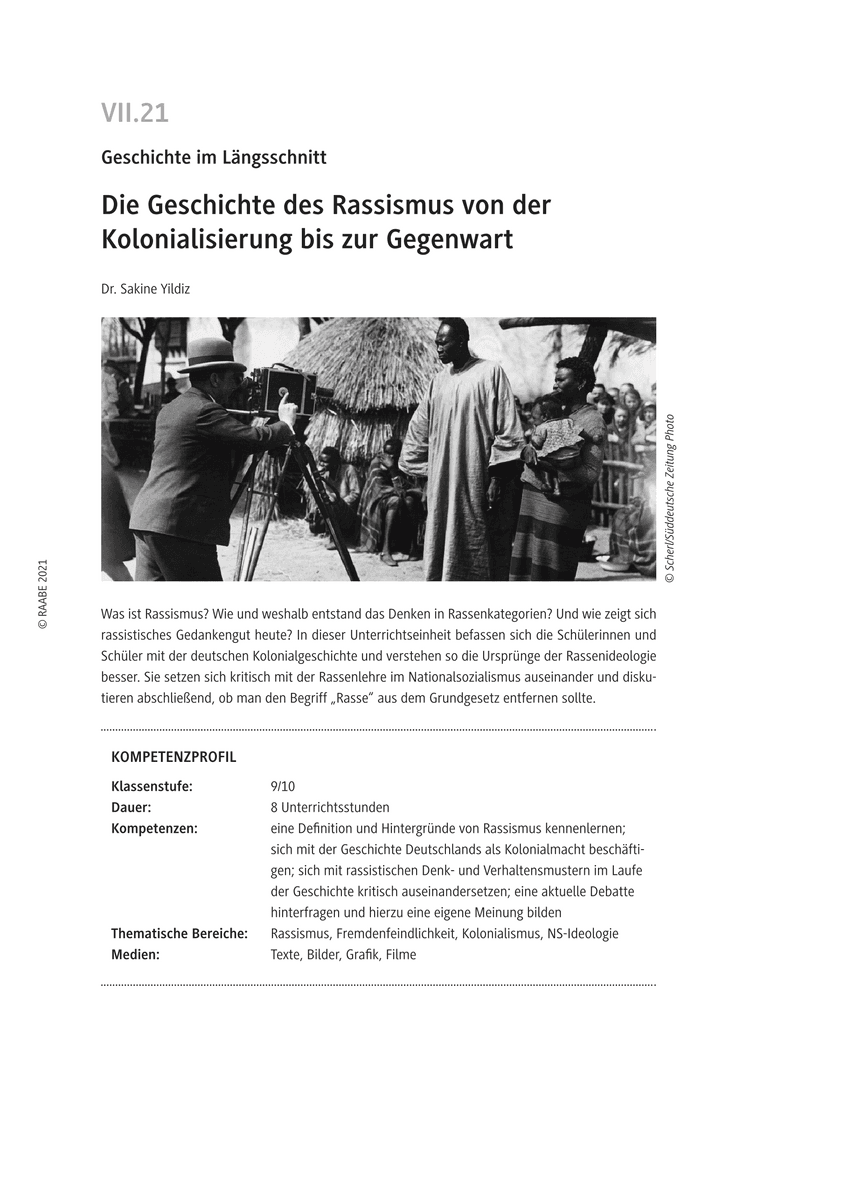 Was ist Rassismus? Wie und weshalb entstand das Denken in Rassenkategorien? Und wie zeigt sich rassistisches Gedankengut heute? In dieser Unterrichtseinheit befassen sich die Schülerinnen und Schüler mit der deutschen Kolonialgeschichte und verstehen so die Ursprünge der Rassenideologie besser. Sie setzen sich kritisch mit der Rassenlehre im Nationalsozialismus auseinander und diskutieren abschließend, ob man den Begriff „Rasse“ aus dem Grundgesetz entfernen sollte.