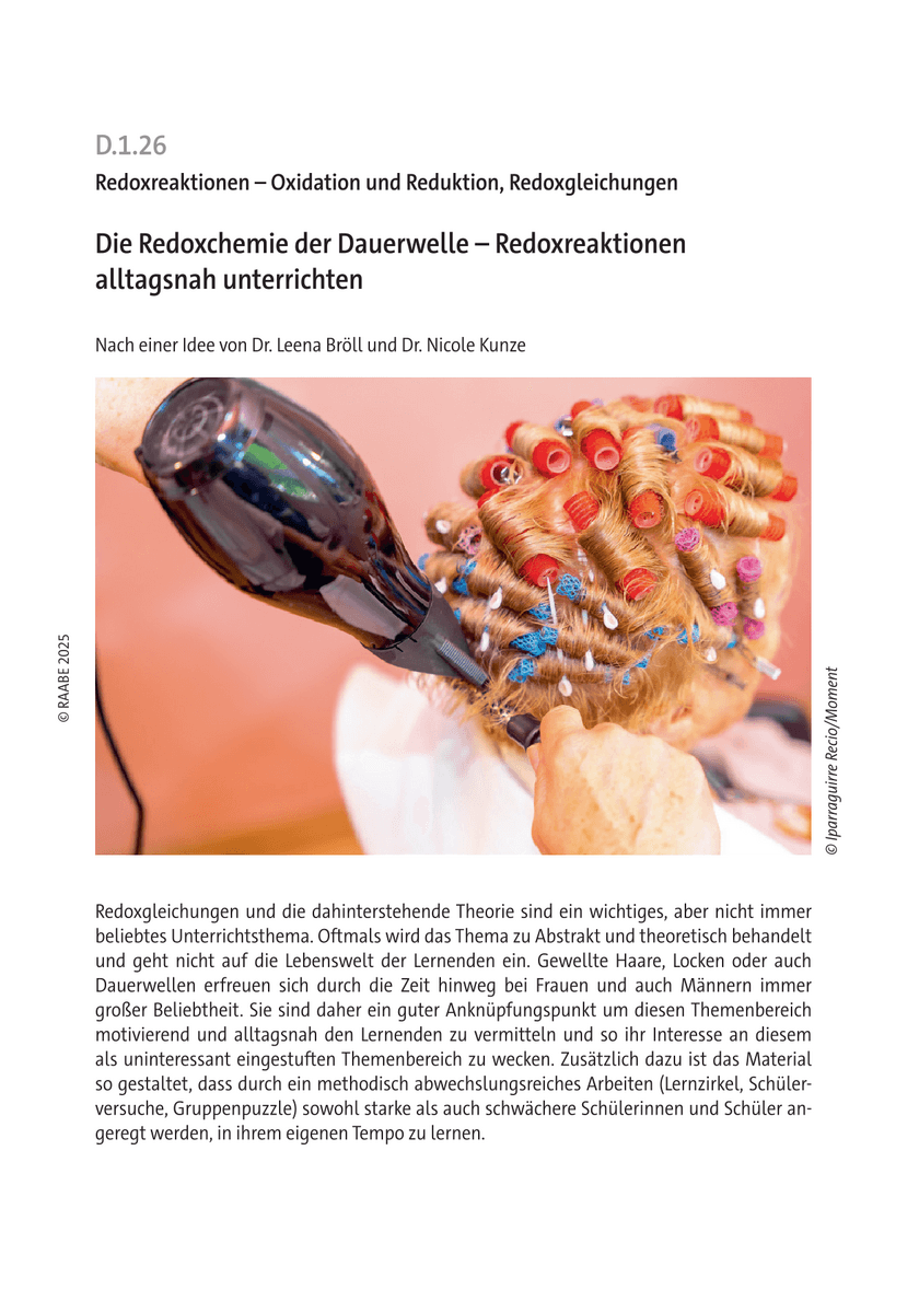 Redoxgleichungen und die dahinterstehende Theorie sind ein wichtiges, aber nicht immer beliebtes Unterrichtsthema. Oftmals wird das Thema zu Abstrakt und theoretisch behandelt und geht nicht auf die Lebenswelt der Lernenden ein. Gewellte Haare, Locken oder auch Dauerwellen erfreuen sich durch die Zeit hinweg bei Frauen und auch Männern immer großer Beliebtheit. Sie sind daher ein guter Anknüpfungspunkt um diesen Themenbereich motivierend und alltagsnah den Lernenden zu vermitteln und so ihr Interesse an diesem als uninteressant eingestuften Themenbereich zu wecken. Zusätzlich dazu ist das Material so gestaltet, dass durch ein methodisch abwechslungsreiches Arbeiten (Lernzirkel, Schülerversuche, Gruppenpuzzle) sowohl starke als auch schwächere Schülerinnen und Schüler angeregt werden, in ihrem eigenen Tempo zu lernen.