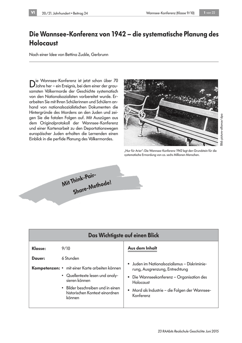 Die Wannsee-Konferenz ist jetzt schon über 70 Jahre her – ein Ereignis, bei dem einer der grausamsten Völkermorde der Geschichte systematisch von den Nationalsozialisten vorbereitet wurde. Erarbeiten Sie mit Ihren Schülerinnen und Schülern anhand von nationalsozialistischen Dokumenten die Hintergründe des Mordens an den Juden und zeigen Sie die fatalen Folgen auf. Mit Auszügen aus dem Originalprotokoll der Wannsee-Konferenz und einer Kartenarbeit zu den Deportationswegen europäischer Juden erhalten die Lernenden einen Einblick in die perfide Planung des Völkermordes.