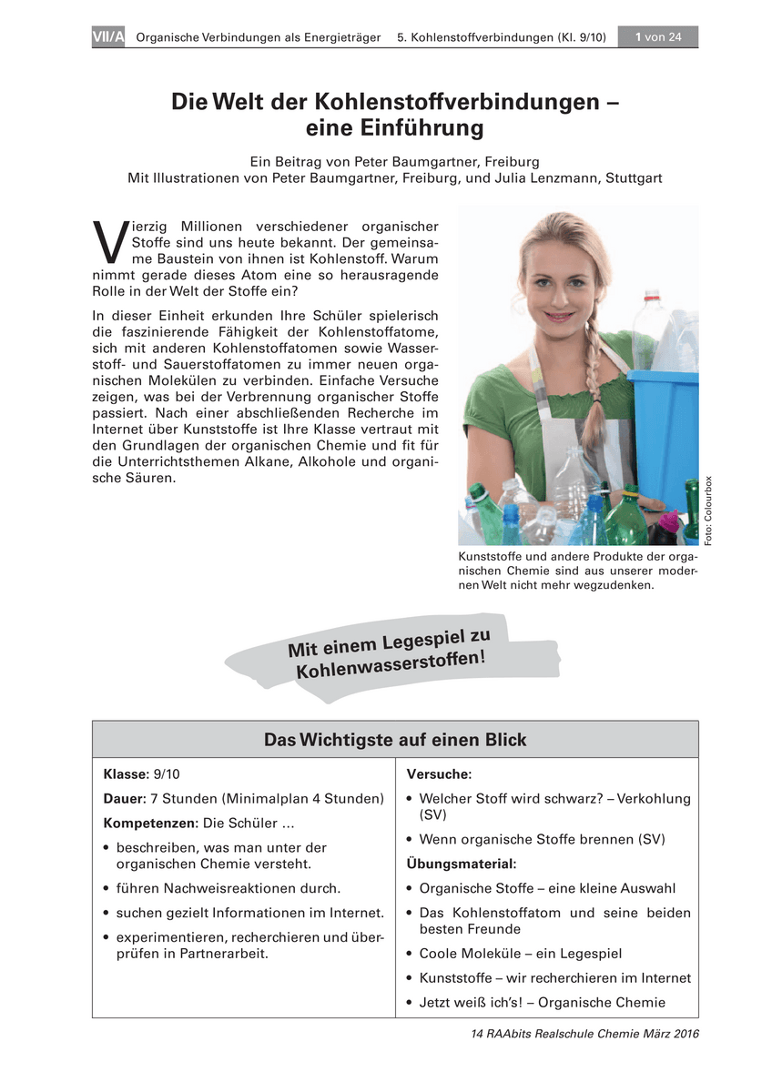 Vierzig Millionen verschiedene organische Stoffe sind uns heute bekannt. Ihr gemeinsamer Baustein ist Kohlenstoff. Warum nimmt gerade dieses Atom eine so herausragende Rolle in der Welt der Stoffe ein? Ihre Schüler erkunden spielerisch die faszinierenden Eigenschaften von Kohlenstoffverbindungen und führen einfache Versuche sowie eine Internetrecherche durch.