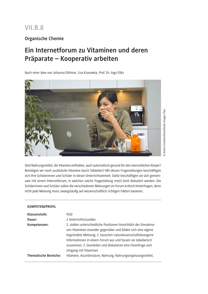 Sind Nahrungsmittel, die Vitamine enthalten, auch automatisch gesund für den menschlichen Körper? Benötigen wir noch zusätzliche Vitamine durch Tabletten? Mit diesen Fragestellungen beschäftigen sich Ihre Schülerinnen und Schüler in dieser Unterrichtseinheit. Dafür beschäftigen sie sich gemeinsam mit einem Internetforum, in welchen solche Fragestellung meist breit diskutiert werden. Die Schülerinnen und Schüler sollen die verschiedenen Meinungen im Forum kritisch hinterfragen, denn nicht jede Meinung muss zwangsläufig auf wissenschaftlich richtigen Fakten basieren.