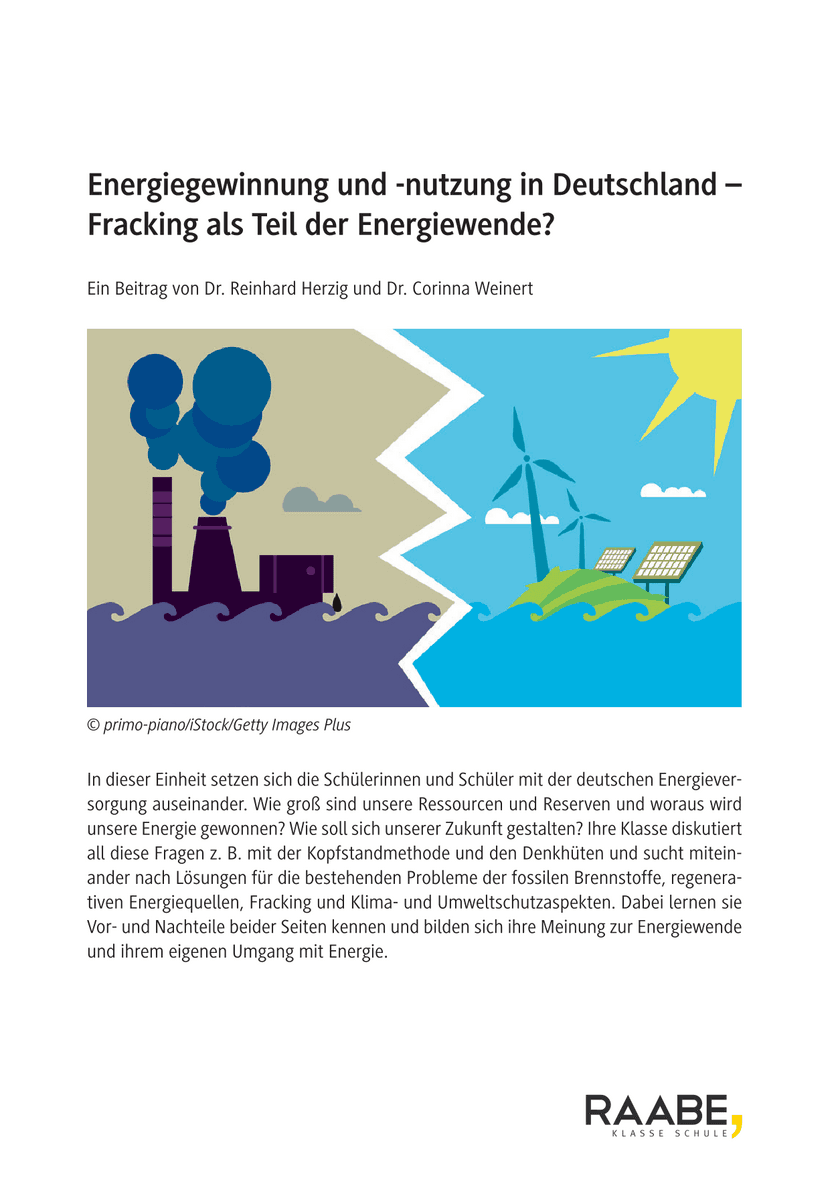 In dieser Einheit setzen sich die Schülerinnen und Schüler mit der deutschen Energieversorgung auseinander. Wie groß sind unsere Ressourcen und Reserven und woraus wird unsere Energie gewonnen? Wie soll sich unserer Zukunft gestalten? Ihre Klasse diskutiert all diese Fragen z. B. mit der Kopfstandmethode und den Denkhüten und sucht miteinander nach Lösungen für die bestehenden Probleme der fossilen Brennstoffe, regenerativen Energiequellen, Fracking und Klima- und Umweltschutzaspekten. Dabei lernen sie Vor- und Nachteile beider Seiten kennen und bilden sich ihre Meinung zur Energiewende und ihrem eigenen Umgang mit Energie.