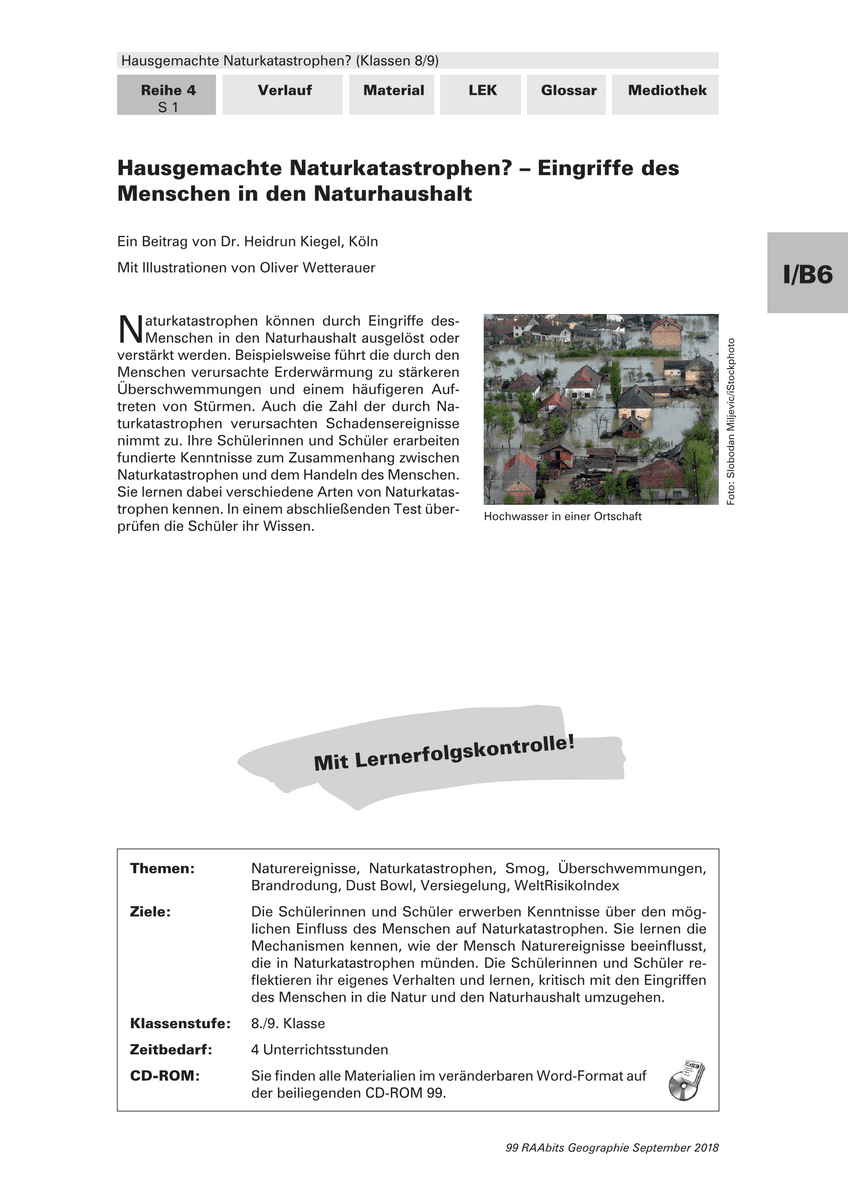 Durch den Eingriff des Menschen in den Naturhaushalt können Naturkatastrophen ausgelöst oder verstärkt werden. Die Ursache für stärkere Überschwemmungen und ein häufigeres Auftreten von Stürmen liegt unter anderem beim vom Menschen verursachten Klimawandel. Allgemein nehmen die durch Naturkatastrophen verursachten Schadensereignisse zu. Ihre Klasse erarbeitet sich fundierte Kenntnisse und erkennt den Zusammenhang zwischen Naturkatastrophen und dem Handeln des Menschen. Am Ende der Einheit findet die Wissensüberprüfung anhand eines Tests statt.