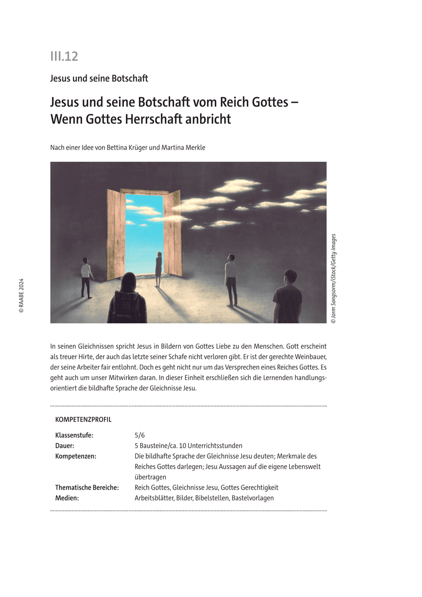 In seinen Gleichnissen spricht Jesus in Bildern von Gottes Liebe zu den Menschen. Gott erscheint als treuer Hirte, der auch das letzte seiner Schafe nicht verloren gibt. Er ist der gerechte Weinbauer, der seine Arbeiter fair entlohnt. Doch es geht nicht nur um das Versprechen eines Reiches Gottes. Es geht auch um unser Mitwirken daran. In dieser Einheit erschließen sich die Lernenden handlungsorientiert die bildhafte Sprache der Gleichnisse Jesu.
