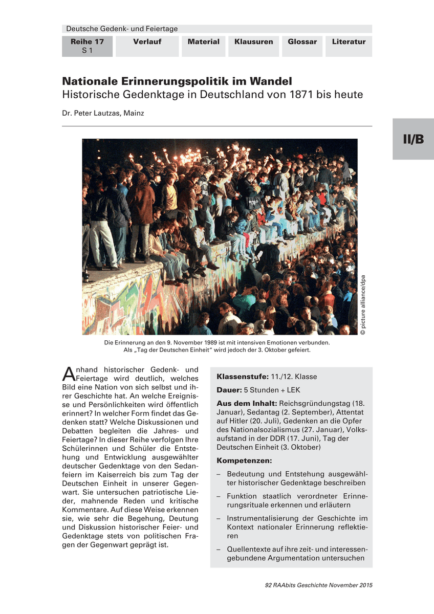 So können Sie kombinieren und kürzenDie Materialien können, wie hier dargestellt, als zusammenhängende Reihe behandelt werden oder aber in Teilen, die jeweils nach der Vermittlung und Besprechung der Fakten eines historischen Abschnitts zur theoretischen Vertiefung dienen. Zudem bieten sich Möglichkeiten der thematischen Ausweitung z. B. hinsichtlich anderer Formen des Erinnerns und Gedenkens an (Denkmäler, Gedenkstätten, Museen).