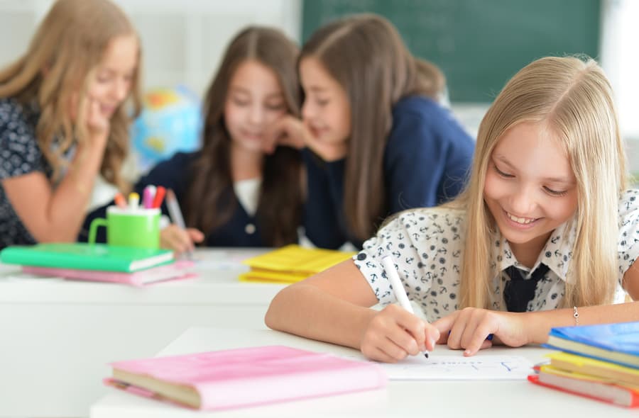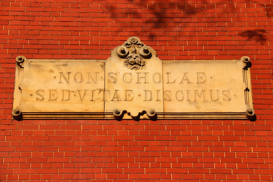Symbolbild eines Schultisches, auf dem im rechten Bildbereich eine lateinische Texttafel mit einem Lorbeerkranz liegt