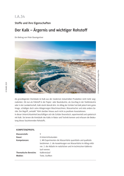 Als grundlegende Chemikalie ist Kalk aus der modernen industriellen Produktion nicht mehr weg-zudenken. Ob nun als Füllstoff in der Papier- oder Bauindustrie, als Zuschlag in der Stahlindustrie oder in der Landwirtschaft, Kalk steckt überall drin. Im Alltag der Schüler hat Kalk jedoch kein gutes Image, schädigen doch seine Ablagerungen Waschmaschinen, Wasserkocher und viele andere Geräte. Der Begriff „verkalkt“ führt darüber hinaus auch nicht zu positiven Assoziationen. In dieser Unterrichtseinheit beschäftigen sich die Schüler theoretisch, experimentell und spielerisch mit Kalk. Sie lernen die Kreisläufe des Kalks in Natur und Technik kennen und erfassen die Bedeutung dieses faszinierenden Rohstoffs.