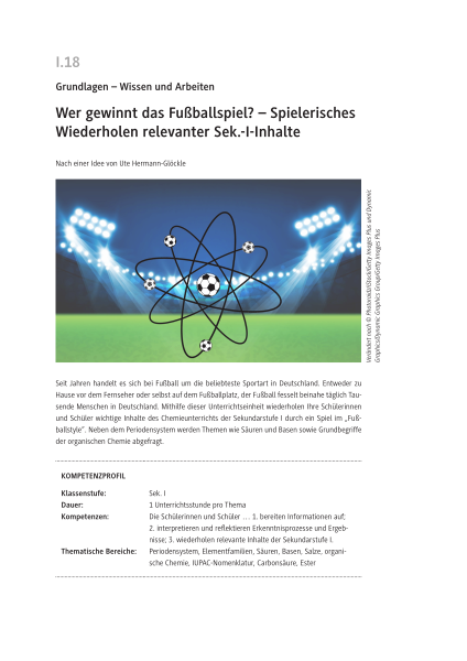 Seit Jahren handelt es sich bei Fußball um die beliebteste Sportart in Deutschland. Entweder zu Hause vor dem Fernseher oder selbst auf dem Fußballplatz, der Fußball fesselt beinahe täglich Tausende Menschen in Deutschland. Mithilfe dieser Unterrichtseinheit wiederholen Ihre Schülerinnen und Schüler wichtige Inhalte des Chemieunterrichts der Sekundarstufe I durch ein Spiel im „Fußballstyle“. Neben dem Periodensystem werden Themen wie Säuren und Basen sowie Grundbegriffe der organischen Chemie abgefragt.