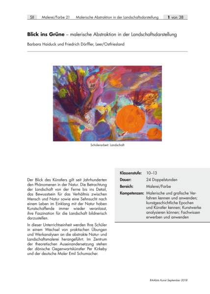 Der Blick des Künstlers gilt seit Jahrhunderten den Phänomenen in der Natur. Die Betrachtung der Landschaft von der Ferne bis ins Detail, das Bewusstsein für das Verhältnis zwischen Mensch und Natur sowie eine Sehnsucht nach einem Leben im Einklang mit der Natur haben Kunstschaffende immer wieder veranlasst, ihre Faszination für die Landschaft bildnerisch darzustellen. In dieser Unterrichtseinheit werden Ihre Schüler in einem Wechsel von praktischen Übungen und Werkanalysen an die abstrakte Natur- und Landschaftsmalerei herangeführt. Im Zentrum der theoretischen Auseinandersetzung stehen der dänische Gegenwartskünstler Per Kirkeby und der deutsche Maler Emil Schumacher.