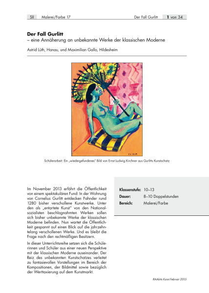 Ende des Jahres 2013 hielt die Kunstwelt den Atem an: Der „Schwabinger-Kunstfund“ in der Wohnung von Cornelius Gurlitt brachte eine Vielzahl an bisher verschollenen Kunstwerken zutage, die das Oeuvre von Kirchner, Beckmann und Co. neu zu bestimmen schienen. In dieser Unterrichtseinheit ermitteln Ihre Schüler nicht nur die Besonderheiten ausgewählter Künstler der klassischen Moderne, sondern beschäftigen sich auch mit Raubkunst und der von den Nationalsozialisten als „entartete Kunst“ diffamierten modernen Kunst.