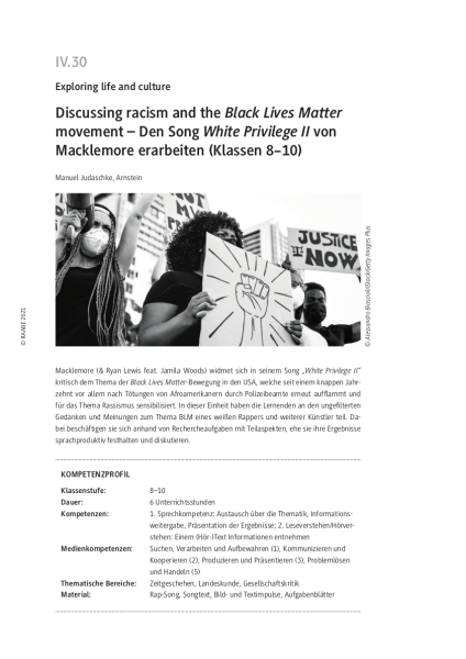 Macklemore (& Ryan Lewis feat. Jamila Woods) widmet sich in seinem Song "White Privilege II" kritisch dem Thema der Black Lives Matter-Bewegung in den USA, welche seit einem knappen Jahrzehnt vor allem nach Tötungen von Afroamerikanern durch Polizeibeamte erneut aufflammt und für das Thema Rassismus sensibilisiert. In dieser Einheit haben die Lernenden an den ungefilterten Gedanken und Meinungen zum Thema BLM eines weißen Rappers und weiterer Künstler teil. Dabei beschäftigen sie sich anhand von Rechercheaufgaben mit Teilaspekten, ehe sie ihre Ergebnisse sprachproduktiv festhalten und diskutieren.